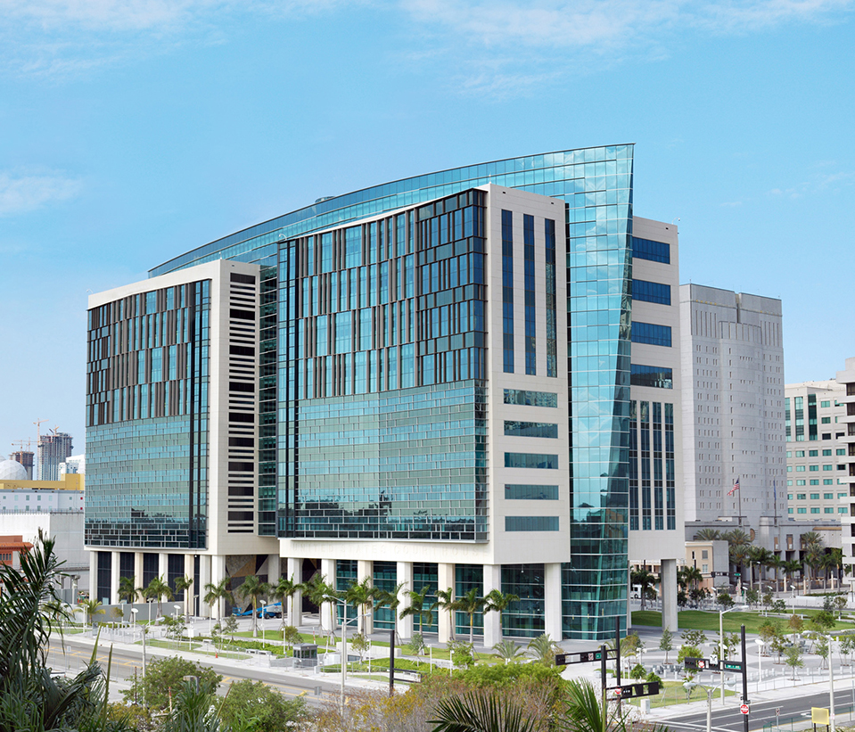 The structural frame, standing 598 feet tall, is enclosed with a panelized glass curtain wall system and stainless steel diagrid cladding. The triangulated steel frame uses 21% less steel than a traditionally framed building, saving 2,000 tons of steel.